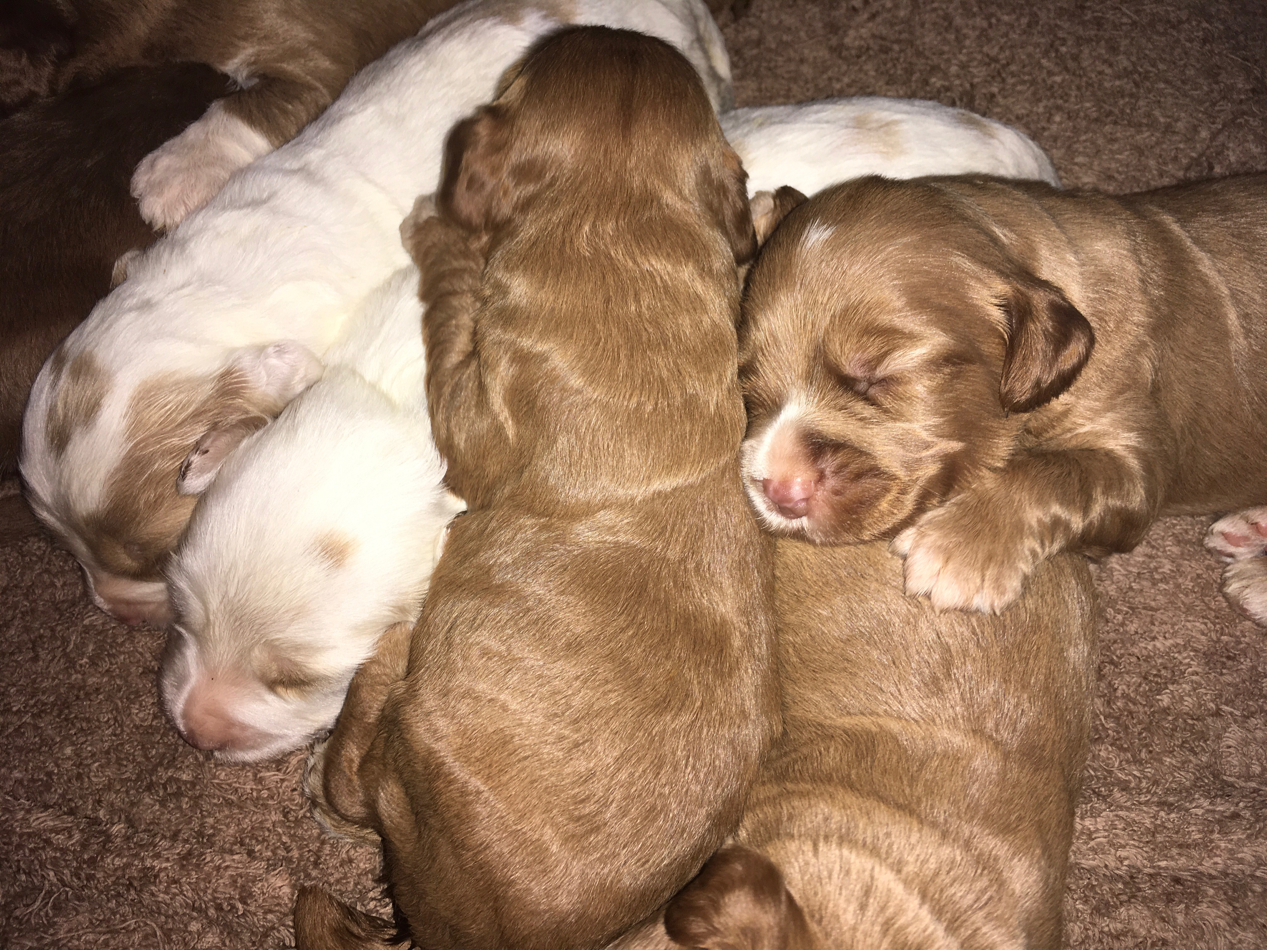 Doc is a sweet miniature golden caramel fleece female, with a rose nose. She is our current champion fetcher; she always brings the ball back. Doc is about 20 lbs and 15 inches tall. Her puppies are in the mini to small medium size range.