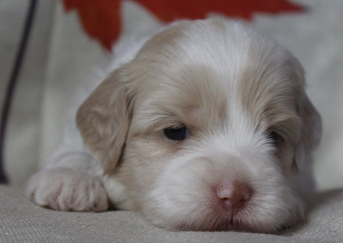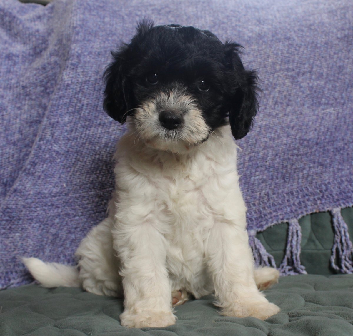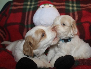 Sufi is a super mellow easy going girl. She has a curly fleece white and tan coat, with a black nose. She is about 30-35 lbs and 16 inches. Sufi's puppies are in the mini to medium size range.